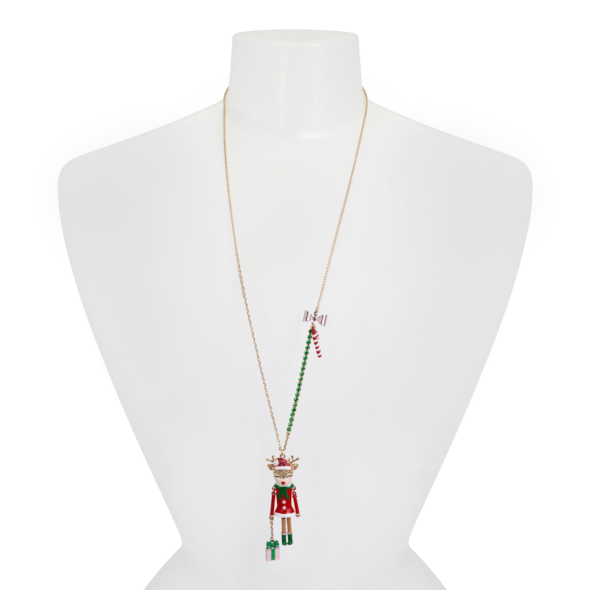 - TRENDY NECKLACES : Refined long chain necklace featuring vibrant green rhinestone chain and festive Christmas reindeer pendant dressed in whimsical ensemble. Adorned with peppermint candy cane and wrapped present charms.
