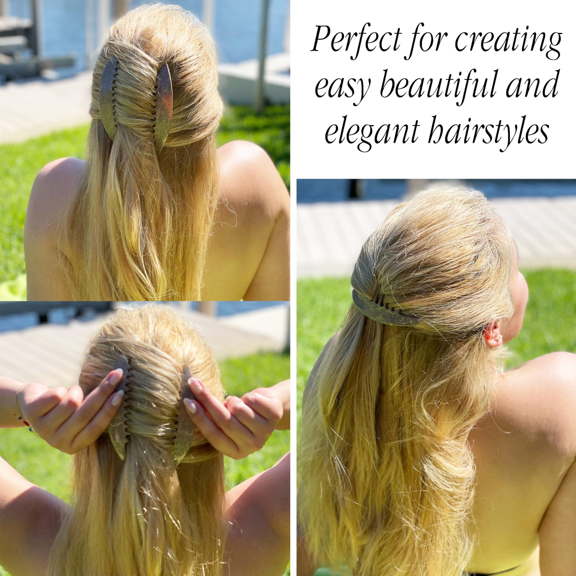 - 5 Inch Large Set of 2. Designed to hold longer and thicker hair. Great curved hair combs for women decorative, good grip side combs clip clamps for ladies, perfect for women with curly, thick, wavy and long hair who loves to create or make new hairstyles, for a party, formal occasions, and daily life. Interlocking combs for all hair types thick or fine. Effortless beauty, quick and easy styling solution for any occasion